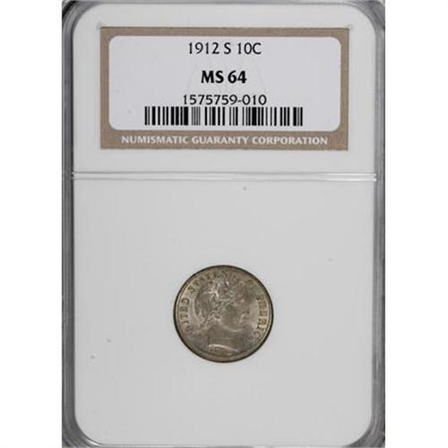 <B>1912-S 10C MS64 NGC.</B></I> NGC Census: (33/34). PCGS Population (53/22). Mintage: 3,420,000. Numismedia Wsl. Price for NGC/PCGS coin in MS64: $408. (#4862)<BR><BR><B>Coin Engraver:</B> Charles E. Barber<BR><BR><b>Shipping:</b> Coins & Currency (<a target="_blank" href="http://www.heritageauctions.com/common/shipping.php">view shipping information</a>)