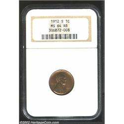 1912-S 1C MS64 Red and Brown NGC. Attractive variegated gold and lilac color. A sharply struck near-Gem with impressive preservation and good luster. Important notice: We expect to be auctioning lots at the rate of 200-250 per hour. Sometimes eBay Premier live bid software cannot keep up with that pace, so we strongly recommend that you place a realistic proxy bid now as insurance to avoid disappointment. Also please note that all Heritage/CAA lots purchased through eBay Premier carry a 20% Buyer's Premium. Please make sure you read the Terms and Conditions.