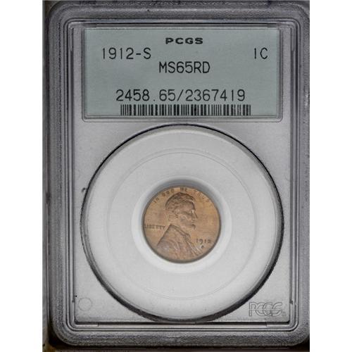 <B>1912-S<1C> MS65 Red PCGS.</B></I> An impressive coin for the specialist who needs the Gem level combined with the Red designation from PCGS. The present coin is sharply impressed for a San Francisco coin of the period, with the lettering squared off and not drawn to the rims, a feature frequently encountered. There is a minute nick in the field near the point of Lincoln's nose and this can serve to identify this coin in the future. Traces of blue are present on the lower obverse. Housed in an older green insert PCGS holder. Population: 35 in 65, 0 finer (3/06).<BR><I>From The Kendall Marie #4 All-Time Finest PCGS Registry of Lincoln Cents with Varieties, Circulation Strikes, 1909-1958.</B></I> <BR><BR><B>Important notice:</B> Heritage usually auctions material at the rate of 200-250 lots per hour. On some occasions eBay Live bid software or the Internet may not be able to keep up with the pace of the auction. We recommend placing a realistic absentee bid now as insurance to avoid disappointment. Occasionally the auctioneer may eliminate or reject an eBay Live bid, and the auctioneer may also reopen a lot after the close of the eBay live bidding (usually because we missed an audience bid), and may reject your bid even if it shows you as the winning bidder. By bidding via eBay Live, you agree that Heritage may award the lot to another bidder at its sole discretion under the circumstances described above or any other reasonable circumstances. Since eBay bids are not shown to us until we open the lot on the floor, we treat those bids just like floor bids. In most cases the floor responds before the eBay bid is presented to us, due to Internet lag time, so for consistency we have made it a policy that floor bids are always considered first over tie eBay live bids. Also please note that all Heritage lots purchased through eBay Live carry a 20% Buyer's Premium. Please make sure you read the Terms and Conditions before you bid. This lot is being auctioned in conjunction with a live floor auction by Heritage Galleries & Auctioneers. All final auction and invoice information will be supplied by Heritage Galleries & Auctioneers, and all other information should be considered preliminary. Lot:477 <BR><BR><B>Winning Notification and Billing:</B> After the FINAL session in this auction is complete, Heritage will send e-mail and snail mail invoices. This process normally takes several days. All final auction and invoice information will be supplied by Heritage Galleries & Auctioneers, and all other information should be considered preliminary. <BR><BR>This auction will be conducted on a live auction floor and over the Internet through eBay Live. If you choose to place an absentee bid, please take a moment to <font color='#0000ff'><u><a href='http://pages.ebay.com/liveauctions/help/before/laabsentee.html'>learn how eBay Live absentee bidding works</a></u></font><font color='#000000'>