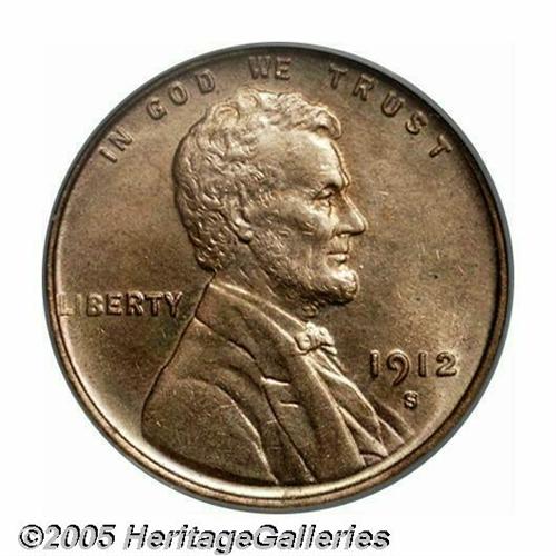 <B>1912-S<1C> MS65 Red PCGS.</B></I> Lange in his book <I>The Complete Guide to Lincoln Cents</B></I> says that Choice and Gem specimens of the '12-S showing any degree of original red color are very scarce. This Gem representative features pleasing copper-orange surfaces with satiny luster and nicely struck devices. A couple of tiny imperfections do not appreciably detract.. Population: 35 in 65, 0 finer (3/05).<BR><I>From The Tom Mershon #2 All-Time PCGS Registry Set of Lincoln Wheat Cents.</B></I>
