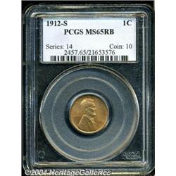 <B>1912-S<1C> MS65 Red and Brown PCGS.</B></I> Well struck and satiny, with rich red-brown coloration, no distracting marks, and minor browning on the reverse. An interesting die clash mark (as struck) extends from near the upper right tip of the C in CENT, to the lower tip of the left wheat ear, and reflects the silhouette of Lincoln's portrait. Population: 17 in 65, 1 finer (7/04). <BR><BR><B>Important notice:</B> Heritage usually auctions material at the rate of 200-250 lots per hour. On some occasions eBay Live bid software or the Internet may not be able to keep up with the pace of the auction. We recommend placing a realistic absentee bid now as insurance to avoid disappointment. Occasionally the auctioneer may eliminate or reject an eBay Live bid, and the auctioneer may also reopen a lot after the close of the eBay live bidding (usually because we missed an audience bid), and may reject your bid even if it shows you as the winning bidder. By bidding via eBay Live, you agree that Heritage may award the lot to another bidder at its sole discretion under the circumstances described above or any other reasonable circumstances. Since eBay bids are not shown to us until we open the lot on the floor, we treat those bids just like floor bids. In most cases the floor responds before the eBay bid is presented to us, due to Internet lag time, so for consistency we have made it a policy that floor bids are always considered first over tie eBay live bids. Also please note that all Heritage lots purchased through eBay Live carry a 20% Buyer's Premium. Please make sure you read the Terms and Conditions before you bid. </span></font></tr></table></td></tr></table>