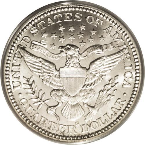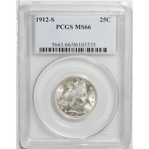 <B>1912-S<25C> MS66 PCGS.</B></I> A brilliant Premium Gem example of one of the more underrated dates in the series, likely overshadowed by its proximity to the 1913-S. The 1912-S is nonetheless a rare date in Mint State, confirmed by the combined NGC-PCGS population data that show only 46 pieces in Gem condition or finer. This essentially brilliant example shows a slight golden cast along with a bit of light haze in part of the obverse field. A bold strike brings up all the star centrils, although some softness is seen on the right (facing) shield corner and right claw. Nonetheless quite high-end and appealing. Population: 8 in 66, 2 finer (9/06).