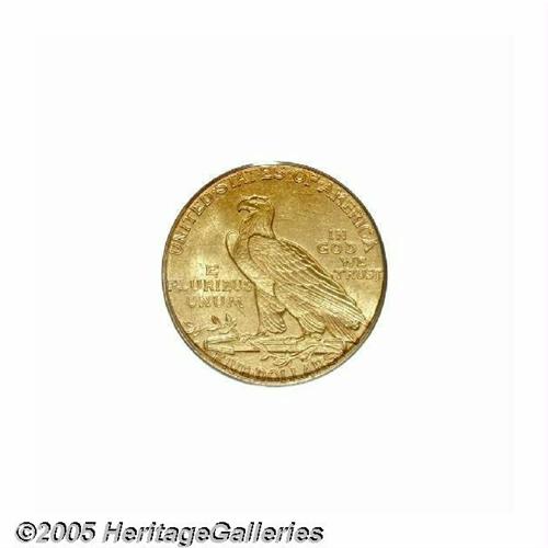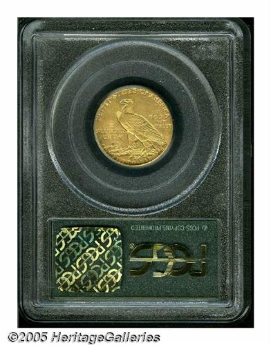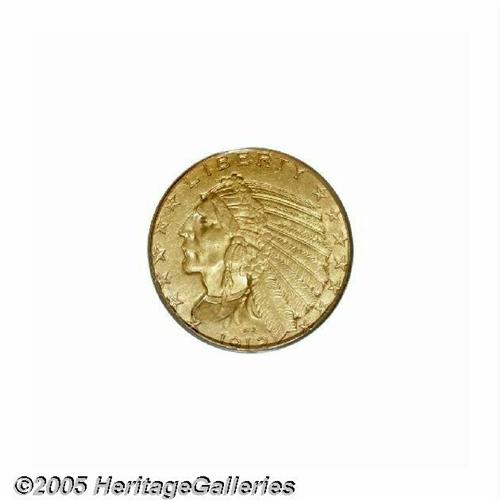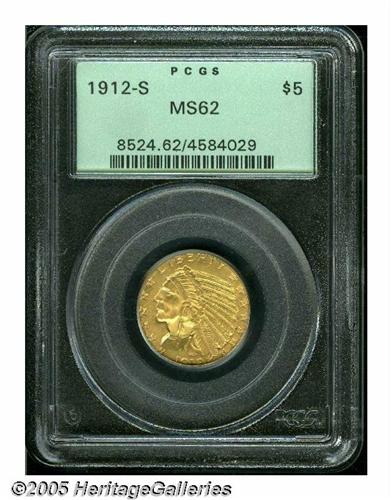 <B>1912-S<$5> MS62 PCGS.</B></I> Sharply struck with pale yellow-gold color and frosty luster. Both sides are accented by traces of iridescent toning. Typical of so many S-Mint issues of the design, the mintmark is outlined but otherwise not detailed. An outstanding example that is seldom encountered in any Mint State grade. Population: 42 in 62, 35 finer (5/05).