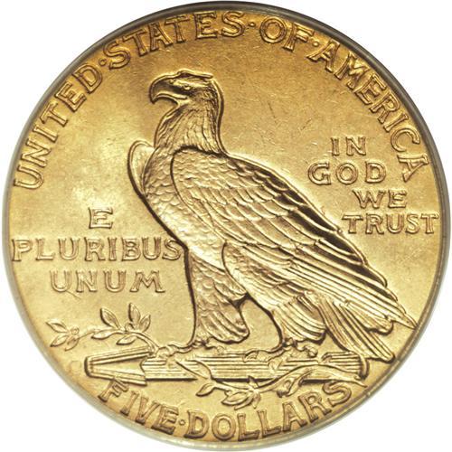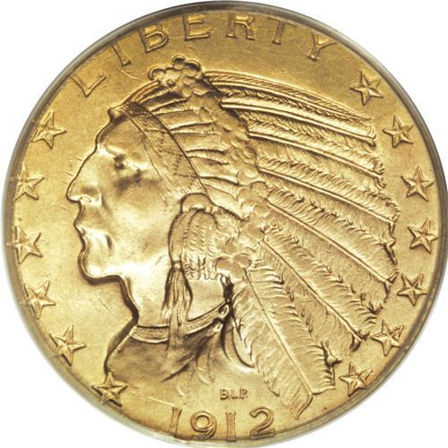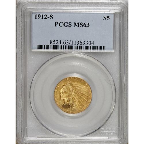 <B>1912-S $5 MS63 PCGS.</B></I> According to the Garrett-Guth <I>Gold Encyclopedia,</B></I> this issue has earned a well-deserved reputation as among the most elusive issues in Mint State, in a series replete with difficult coins. Calling the 1912-S "one of the classic rarities," the authors note that "The series is nearly always found with inferior strikes and luster, and this is one of the lowest-quality issues seen, likely accounting for the few gems graded." While the mintmark on this example is ill-formed, most of the surface shows a decent strike and beautiful coloration in shades of khaki-gold. A couple of small ticks on the Indian's cheek and a scrape below the chin prevent a finer grade, and muted luster is present on the mattelike surfaces. Population: 16 in 63, 21 finer (2/07).<BR><BR><b>Shipping:</b> Coins & Currency (<a target="_blank" href="http://www.heritageauctions.com/common/shipping.php">view shipping information</a>)