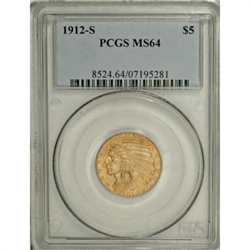 <B>1912-S $5 MS64 PCGS.</B></I> Few 20th century gold coins are so tantalizing as the 1912-S five dollar piece. Garrett and Guth (2006) comment on its comparative and absolute virtues: "One of the classic rarities and most difficult issues to obtain in Mint State, the 1912-S issue has earned its reputation, which is quite a feat considering the number of rarities among the Indian Head half eagle series."<BR> The Choice exemplar offered here displays uncommonly strong detail overall, though the mintmark is softly struck. The subtly lustrous surfaces are surprisingly well-preserved, with only a handful of minor flaws that combine to preclude a better designation. Excessively elusive any finer; the combined certified population shows only one such coin, a single Gem certified by PCGS (11/07).<BR><BR><B>Coin Engraver:</B> Bela Lyon Pratt<BR><BR><b>Shipping:</b> Coins & Currency (<a target="_blank" href="http://www.heritageauctions.com/common/shipping.php">view shipping information</a>)