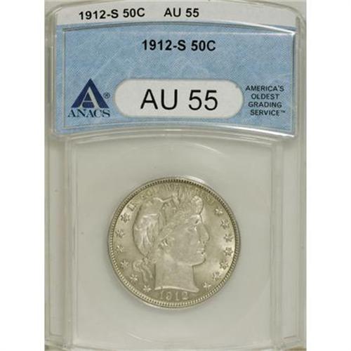 <B>1912-S 50C AU55 ANACS.</B></I> NGC Census: (1/80). PCGS Population (9/100). Mintage: 1,370,000. Numismedia Wsl. Price for NGC/PCGS coin in AU55: $333. (#6526)<BR><BR><B>Coin Engraver:</B> Charles E. Barber<BR><BR><b>Shipping:</b> Coins & Currency (<a target="_blank" href="http://www.heritageauctions.com/common/shipping.php">view shipping information</a>)