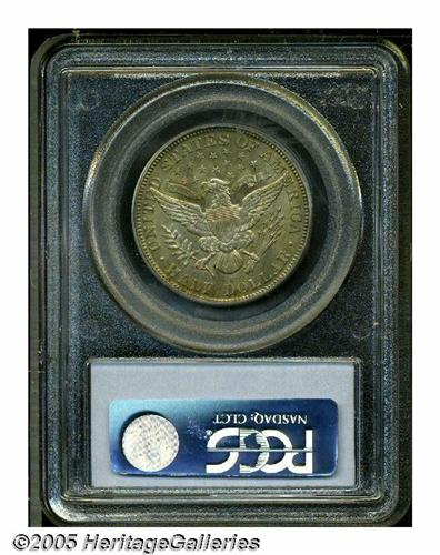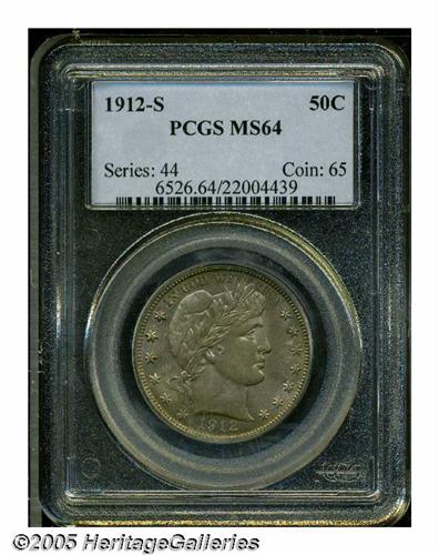 <B>1912-S<50C> MS64 PCGS.</B></I> The smooth surfaces display deep toning over both sides, and no major post-striking impairments. Violet-gray patina dominates the obverse, while the reverse shows a combination of olive, sea-green, and speckled russet colors. Fully struck with vibrant luster. Much scarcer in Choice and finer conditions than a mintage of 1,370,000 pieces might suggest. Population: 22 in 64, 20 finer (6/05).
