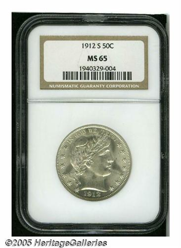 <B>1912-S<50C> MS65 NGC.</B></I> Hints of light gold toning visit the obverse and enrich the reverse. Wisps of sky-blue color are noted along the reverse rim. A lustrous and boldly struck Gem with exceptional preservation. Scarce in all grades above Fine, the 1912-S is decidedly rare at the MS65 level. Population: 4 in 65, 5 finer (6/05).