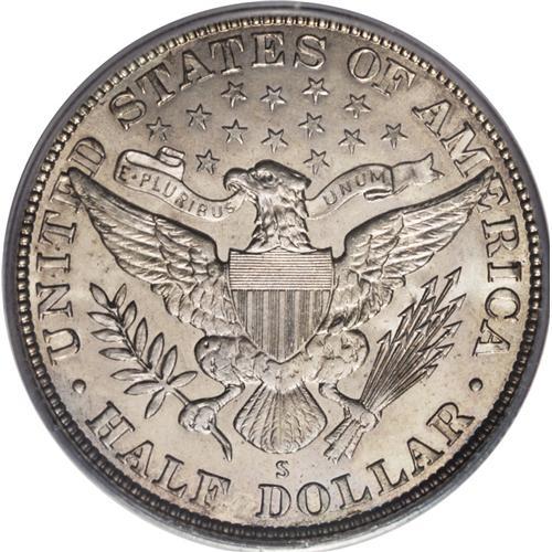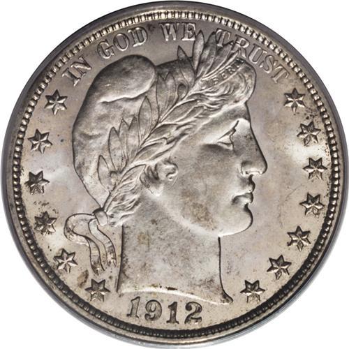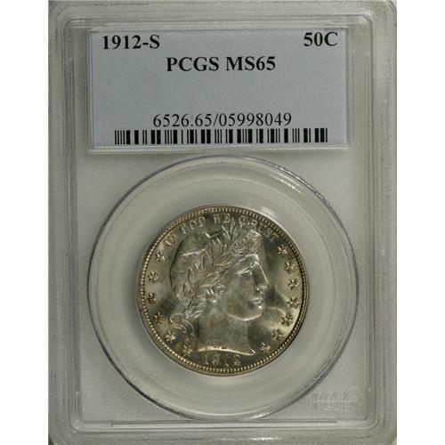 <B>1912-S 50C MS65 PCGS.</B></I> Standout luster and arm's-length eye appeal are the hallmarks of this exquisite and rare S-mint issue. Tinges of ice-blue and yellow-green grace each side, with a few undistracting flecks of darker toning near the rims. The strike is sharp, if a tad less than full, with localized softness only on the right (facing) shield corner and the area nearby.<BR><BR><b>Shipping:</b> Coin/Currency (<a target="_blank" href="http://www.heritageauctions.com/common/shipping.php">view shipping information</a>)