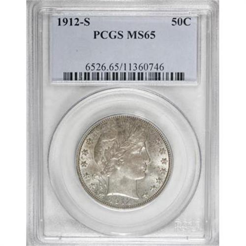 <B>1912-S 50C MS65 PCGS.</B></I> Well struck with scintillating luster and a pleasing layer of steel-green toning across both sides, topped by numerous specks of charcoal-green and russet patina. The surfaces are expertly preserved and free of any distracting blemishes or bagmarks. An attractive and conditionally scarce Gem example of this Barber half dollar date. Population: 19 in 65, 7 finer (12/07). <BR><BR><B>Coin Engraver:</B> Charles E. Barber<BR><BR><b>Shipping:</b> Coins & Currency (<a target="_blank" href="http://www.heritageauctions.com/common/shipping.php">view shipping information</a>)