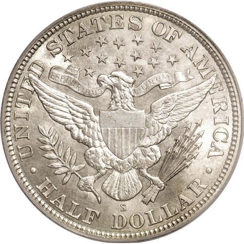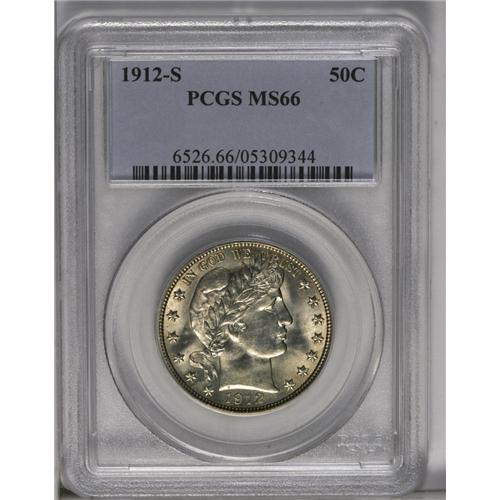 <B>1912-S<50C> MS66 PCGS.</B></I> A better date in the Barber half series, one seldom seen in any Mint State grade, much less the lofty MS66 ranking of the present piece. This delectable example is virtually untoned, with a slight golden cast on each side. The strike is boldly executed, with a touch of softness only on the right (facing) shield corner and the right claw, but much better than usually seen on this issue. The cartwheel luster is robust and ebullient, and there are no mentionable impairments. This Premium Gem is one of only seven pieces so graded at PCGS, with none finer. NGC has certified another six MS66 coins, along with the lone MS67 example (6/06).