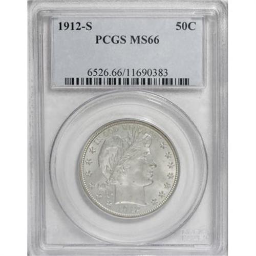 <B>1912-S 50C MS66 PCGS.</B></I> Light olive and powder-blue toning enriches this satiny and precisely struck Barber half. Carefully preserved with a mark-free reverse and an uncommonly smooth obverse field. A scarcer date that currently trades for only a moderate premium. Population: 7 in 66, 0 finer (6/07).<BR><I>From The Belle Glade Collection, Part Two.</B></I><BR><BR><B>Coin Engraver:</B> Charles E. Barber<BR><BR><b>Shipping:</b> Coins & Currency (<a target="_blank" href="http://www.heritageauctions.com/common/shipping.php">view shipping information</a>\)