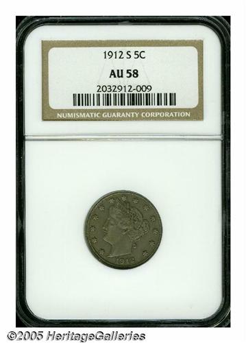 1912-S 5C AU58 NGC. The key date, low mintage 191