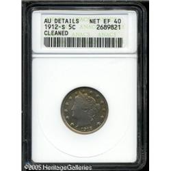 <B>1912-S 5C --Cleaned--ANACS. AU Details, Net XF40.</B></I> Dulled from cleaning, each side shows a combination of golden and gray toning. Weakly defined on Liberty's hair. Lot:5902