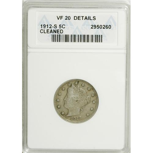 <B>1912-S 5C --Cleaned--ANACS. VF20 Details.</B></I> NGC Census: (14/419). PCGS Population (11/531). Mintage: 238,000. Numismedia Wsl. Price: $392. (#3875)<BR><BR><b>Shipping:</b> Coins & Currency (<a target="_blank" href="http://www.heritageauctions.com/common/shipping.php">view shipping information</a>)
