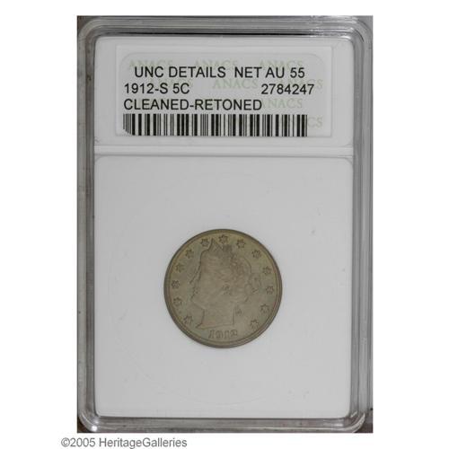 1912-S 5C --Cleaned, Retoned--ANACS. Unc Details, Net A 1912-S[5C]--Cleaned, Retoned--ANACS. Unc Det