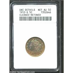 <TR><TD width="100%"><TABLE cellSpacing=1 cellPadding=3 width="100%" border=0><TBODY><TR><TD width="100%" bgColor=#79735c><FONT face=arial color=#ffffff size=3><B>Description</B> </FONT></TD></TR><TR><TD width="100%" bgColor=#ffffff><FONT face=arial size=2><B>1912-S 5C --Cleaned, Retoned--ANACS. Unc Details, Net AU50.</B></I> Bands of apple-green, lime-green, violet, and lemon patina enliven this satiny and well struck piece. The cheek has a faint curved luster graze. The lowest mintage issue in the series. </FONT></TD></TR></TBODY></TABLE></TD></TR></TBODY></TABLE><BR><A name=PricesRealized></A><TABLE cellSpacing=0 cellPadding=0 width="100%" bgColor=#000000 border=0><TBODY><TR><TD width="100%"><TABLE cellSpacing=1 cellPadding=3 width="100%" border=0><TBODY><TR><TD width="100%" bgColor=#79735c><A name=PR><FONT face=arial color=#ffffff size=3><B>Previous Prices from Heritage Auctions</B> </FONT></A></TD></TR><TR><TD bgColor=#f6f6ed>No Prior Data Recorded </TD></TR><TR><TD bgColor=#ffffff><FONT face=arial size=1 ?>PLEASE NOTE: All prices realized reflect the final hammer price PLUS the buyer's premium in auctions that charge a buyer's premium. Each item has a notation at the top of the listing indicating whether that lot included a buyer's premium. Example: A item that sells with a final hammer price of $100 and a 20% buyer's premium will display with a price realized of $120. All information listed is intended to be as accurate as possible, but errors are possible. Please use this guide carefully and inform us of any inaccuracies. </FONT></TD></TR></TBODY></TABLE></TD></TR></TBODY></TABLE><BR><TABLE cellSpacing=0 cellPadding=0 width="100%" bgColor=#000000 border=0><TBODY><TR><TD width="100%"><TABLE cellSpacing=1 cellPadding=3 width="100%" border=0><TBODY><TR><TD width="100%" bgColor=#79735c colSpan=6><FONT face=arial color=#ffffff size=3><B>Price Guide*</B> </FONT></TD></TR><TR bgColor=#f6f6ed><TD align=middle><B>Grade</B> </TD><TD align=middle><B>Coin World<BR>(Trends)</B> </TD><TD align=middle><B>Numismedia<BR>Retail</B> </TD><TD align=middle><B>Numismedia<BR>Wholesale</B> </TD><TD align=middle><B>Coin<BR>Universe</B> </TD><TD align=middle><B>Heritage<BR>Value Index</B> </TD></TR><TR bgColor=#ffffff><TD align=middle>45</TD><TD align=right>---</TD><TD align=right>---</TD><TD align=right>---</TD><TD align=right>---</TD><TD align=right>$536.06</TD></TR><TR style="FONT-WEIGHT: bold" bgColor=#cccfdd><TD align=middle>50</TD><TD align=right>$1,200.00</TD><TD align=right>$730.00</TD><TD align=right>$610.00</TD><TD align=right>---</TD><TD align=right>$672.94</TD></TR><TR bgColor=#ffffff><TD align=middle>53</TD><TD align=right>---</TD><TD align=right>$810.00</TD><TD align=right>$675.00</TD><TD align=right>---</TD><TD align=right>$697.38</TD></TR><TR bgColor=#ffffff><TD colSpan=6><FONT size=1>*All information listed is intended to be as accurate as possible, but errors are possible. No item may be returned or refused based on this information which is provided as a service to our customers. You should contact each pricing source directly to determine the accuracy of this information. </FONT></TD></TR></TBODY></TABLE></TD></TR></TBODY></TABLE><BR><TABLE cellSpacing=0 cellPadding=0 width="100%" bgColor=#000000 border=0><TBODY><TR><TD width="100%"><TABLE cellSpacing=1 cellPadding=3 width="100%" border=0><TBODY><TR><TD width="100%" bgColor=#79735c><FONT face=arial color=#ffffff size=3><B>Population Guide</B> </FONT></TD></TR><TR bgColor=#ffffff><TD align=middle><!-- Begin Output of Population Grid--><TABLE cellSpacing=0 cellPadding=0 width="100%" border=0><TBODY><TR><TD vAlign=center><TABLE cellSpacing=0 width="100%" border=1 cellsadding="3"><TBODY><TR><TD vAlign=center><TABLE cellSpacing=0 cellPadding=3 width="100%" border=1><TBODY><TR><TD vAlign=center align=middle bgColor=#f0f1e8 colSpan=2 <CENTER><FONT face=Arial size=2><B>PCGS Pop </B></FONT><CENTER></CENTER></TD><TD vAlign=center align=middle bgColor=#f0f1e8 colSpan=2><CENTER><FONT face=Arial size=2><B>NGC Pop</B></CENTER></FONT></TD></TR><TR><TD vAlign=center><FONT face=Arial size=2>(50)</FONT> </TD><TD vAlign=center align=right><FONT face=Arial size=2>1</FONT> </TD><TD vAlign=center><FONT face=Arial size=2>(50)</FONT> </TD><TD vAlign=center align=right><FONT face=Arial size=2>0</FONT> </TD></TR><TR><TD vAlign=center><FONT face=Arial size=2>(>50)</FONT> </TD><TD vAlign=center align=right><FONT face=Arial size=2>389</FONT> </TD><TD vAlign=center><FONT face=Arial size=2>(>50)</FONT> </TD><TD vAlign=center align=right><FONT face=Arial size=2>323</FONT> </TD></TR></TBODY></TABLE></TD></TR></TBODY></TABLE></TD></TR></TBODY></TABLE><!-- End Output of Population Grid--></TD></TR></TBODY></TABLE></TD></TR></TBODY></TABLE><BR><TABLE cellSpacing=0 cellPadding=0 width="100%" bgColor=#000000 border=0><TBODY><TR> Important notice: We expect to be auctioning lots at the rate of 200-250 per hour. On occasion eBay live bid software cannot keep up with the pace of the auctions where 4-5 lots per minute can hammer down, so we recommend that you place a realistic absentee bid now as insurance to avoid disappointment. Also please note that all Heritage/CAA lots purchased through eBay Live carry a 20% Buyer's Premium. Please make sure you read the Terms and Conditions.