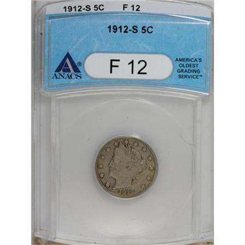 <B>1912-S 5C F12 ANACS.</B></I> NGC Census: (86/432). PCGS Population (89/601). Mintage: 238,000. Numismedia Wsl. Price for NGC/PCGS coin in F12: $204. (#3875)<BR><BR><B>Coin Engraver:</B> Charles E. Barber<BR><BR><b>Shipping:</b> Coins & Currency (<a target="_blank" href="http://www.heritageauctions.com/common/shipping.php">view shipping information</a>)