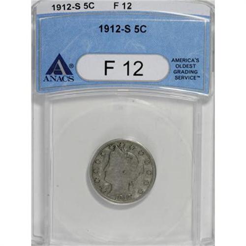 <B>1912-S 5C F12 ANACS.</B></I> NGC Census: (86/432). PCGS Population (106/614). Mintage: 238,000. Numismedia Wsl. Price for NGC/PCGS coin in F12: $204. (#3875)<BR><BR><B>Coin Engraver:</B> Charles E. Barber<BR><BR><b>Shipping:</b> Coins & Currency (<a target="_blank" href="http://www.heritageauctions.com/common/shipping.php">view shipping information</a>)