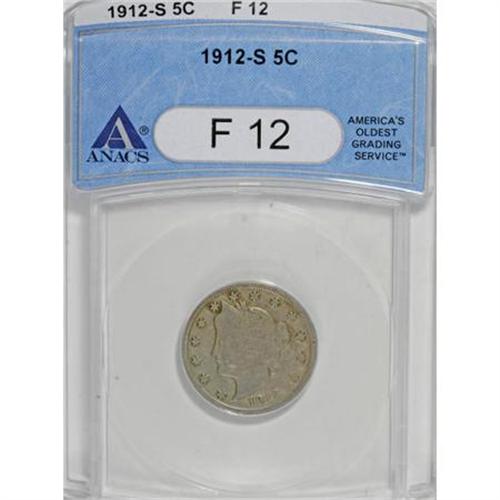 <B>1912-S 5C F12 ANACS.</B></I> NGC Census: (86/432). PCGS Population (106/614). Mintage: 238,000. Numismedia Wsl. Price for NGC/PCGS coin in F12: $204. (#3875)<BR><BR><B>Coin Engraver:</B> Charles E. Barber<BR><BR><b>Shipping:</b> Coins & Currency (<a target="_blank" href="http://www.heritageauctions.com/common/shipping.php">view shipping information</a>)