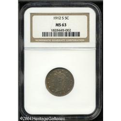 1912-S 5C MS63 NGC. The only S-mint Liberty Nickel <B>1912-S 5C MS63 NGC.</B></I> The only S-mint Liberty Nickel and one of the three key dates in the series. Richly toned and fairly well struck, though the corn and wheat ears are weak. The surfaces are devoid of mentionable marks. <BR><BR><B>Important notice:</B> Heritage usually auctions material at the rate of 200-250 lots per hour. On some occasions eBay Live bid software or the Internet may not be able to keep up with the pace of the auction. We recommend placing a realistic absentee bid now as insurance to avoid disappointment. Occasionally the auctioneer may eliminate or reject an eBay Live bid, and the auctioneer may also reopen a lot after the close of the eBay live bidding (usually because we missed an audience bid), and may reject your bid even if it shows you as the winning bidder. By bidding via eBay Live, you agree that Heritage may award the lot to another bidder at its sole discretion under the circumstances described above or any other reasonable circumstances. Since eBay bids are not shown to us until we open the lot on the floor, we treat those bids just like floor bids. In most cases the floor responds before the eBay bid is presented to us, due to Internet lag time, so for consistency we have made it a policy that floor bids are always considered first over tie eBay live bids. Also please note that all Heritage lots purchased through eBay Live carry a 20% Buyer's Premium. Please make sure you read the Terms and Conditions before you bid. This lot is being auctioned in conjunction with a live floor auction by Heritage Galleries & Auctioneers. All final auction and invoice information will be supplied by Heritage Galleries & Auctioneers, and all other information should be considered preliminary. Lot:5537