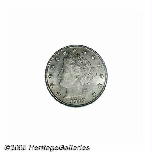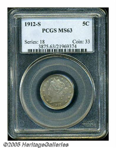 <B>1912-S<5C> MS63 PCGS.</B></I> Softly struck and moderately toned, with streaky gray-tan color augmented by hints of orange iridescence that cling to many of the devices. Although essentially mark-free, this piece is somewhat lacking in the strike and luster department, which helps to limit the grade.