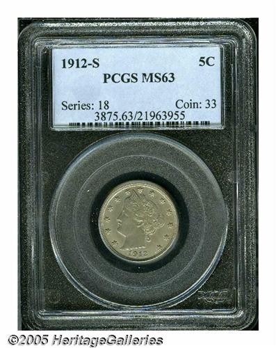 <B>1912-S<5C> MS63 PCGS.</B></I> Uncommonly well struck for this typically mushy branch mint issue beneath a coating of rose-gray patina. A shallow, curving facial blemish thwarts a bid for a higher grade.<BR><I>From The Empire State Collection.</B></I>