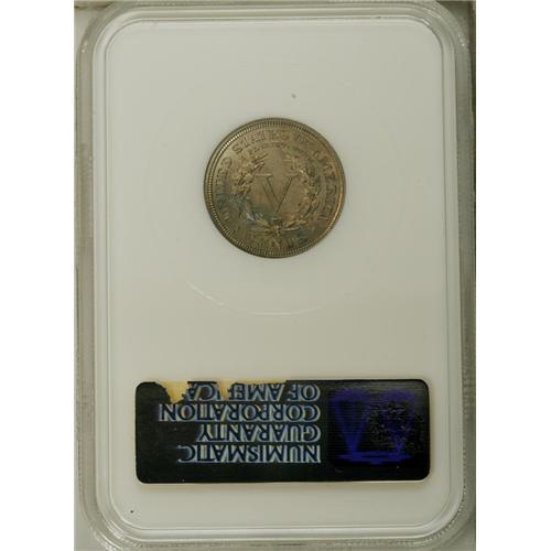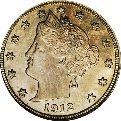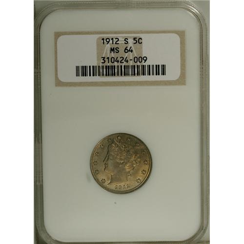 <B>1912-S 5C MS64 NGC.</B></I> Khaki-gold and cobalt-blue swaths alternate across this suitably struck and unperturbed near-Gem. San Francisco first struck cents in 1908, but waited until the waning days of the Liberty nickel to strike the low mintage 1912-S. Housed in a prior generation holder.<BR><BR><b>Shipping:</b> Coin/Currency (<a target="_blank" href="http://www.heritageauctions.com/common/shipping.php">view shipping information</a>)