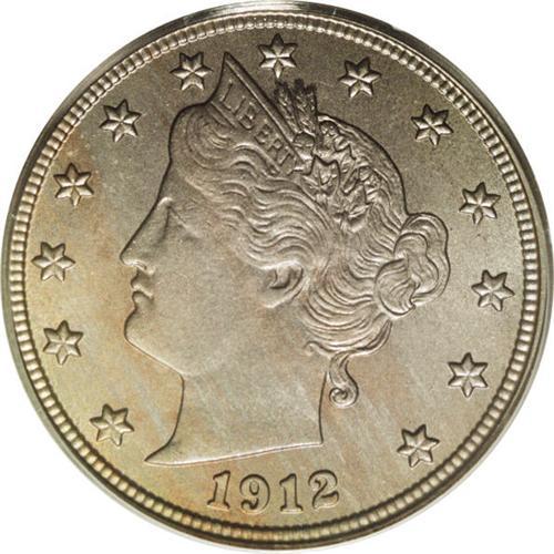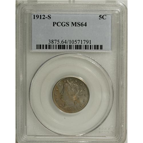 <B>1912-S 5C MS64 PCGS.</B></I> A key-date issue that has been rare since Day One, and an issue that was literally coined for only four days, beginning on Christmas Eve in 1912. All examples are lightly struck, and many pieces show bulging in the obverse field, although the present piece does not. This piece shows some pretty diagonal toning in shades of peach-gold. The light strike is visible at the juncture of the hair and forehead and on the left ear of corn (as throughout the series), but the star centrils are full, and other areas of the wreath show good detailing.<BR><BR><b>Shipping:</b> Coin/Currency (<a target="_blank" href="http://www.heritageauctions.com/common/shipping.php">view shipping information</a>)