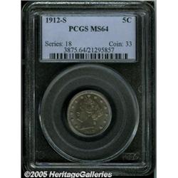 <B>1912-S 5C MS64 PCGS.</B></I> Fully lustrous beneath a moderate coating of silver-rose patina. The strike, while not absolutely full, is decent, and the surfaces display only two or three minor contact marks that limit the grade. A very nice example of this much scarcer date.<BR><I>From The Napa Valley Collection.</B></I>