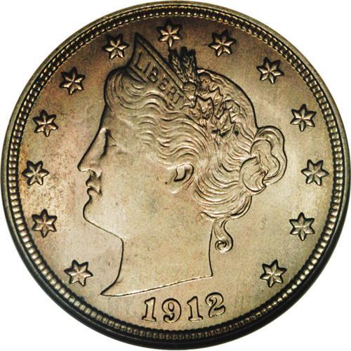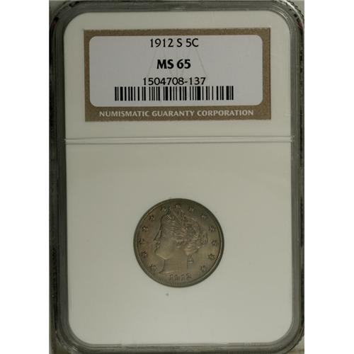 <B>1912-S 5C MS65 NGC.</B></I> With an original mintage of only 238,000 pieces, it is little wonder that this S-mint delivery is a key date in the series. Both sides of this lovely Gem display deep olive and rose patina over essentially mark-free surfaces. An odd, mint-made line vertically bisects the reverse. While some of the lower wreath details display softness of strike, the balance of the features are quite well impressed. An attractive representation of this historically significant Liberty Head nickel issue. Census: 79 in 65, 5 finer (11/06).<BR><BR><b>Shipping:</b> Coin/Currency (<a target="_blank" href="http://www.heritageauctions.com/common/shipping.php">view shipping information</a>)