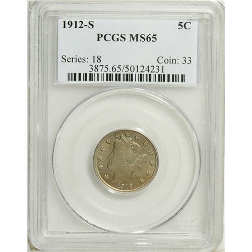 <B>1912-S 5C MS65 PCGS.</B></I> A solid Gem example of this key date in the Liberty nickel series. One of only two branch mint nickels struck with this design; only 238,000 pieces were produced. This piece shows the typical soft strike and satin-like luster, with a pale overlay of rose patina on the reverse. Close examination reveals nothing in the way of surface distractions on either side of the piece. Population: 73 in 65, 8 finer (10/06).<BR><I>From The Park Cities Collection.</B></I><BR><BR><b>Shipping:</b> Coin/Currency (<a target="_blank" href="http://www.heritageauctions.com/common/shipping.php">view shipping information</a>)
