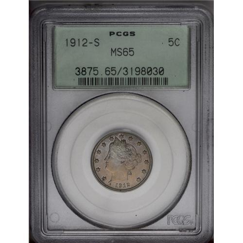<B>1912-S<5C> MS65 PCGS.</B></I> In addition to impeccable surface quality and lovely pastel toning, the strike on this wonderfully preserved San Francisco issue is significantly finer than is most-often encountered. A few scattered carbon flecks are really trivial in the overall scheme of things. Population: 71 in 65, 8 finer (3/06). <BR><BR><B>Important notice:</B> Heritage usually auctions material at the rate of 200-250 lots per hour. On some occasions eBay Live bid software or the Internet may not be able to keep up with the pace of the auction. We recommend placing a realistic absentee bid now as insurance to avoid disappointment. Occasionally the auctioneer may eliminate or reject an eBay Live bid, and the auctioneer may also reopen a lot after the close of the eBay live bidding (usually because we missed an audience bid), and may reject your bid even if it shows you as the winning bidder. By bidding via eBay Live, you agree that Heritage may award the lot to another bidder at its sole discretion under the circumstances described above or any other reasonable circumstances. Since eBay bids are not shown to us until we open the lot on the floor, we treat those bids just like floor bids. In most cases the floor responds before the eBay bid is presented to us, due to Internet lag time, so for consistency we have made it a policy that floor bids are always considered first over tie eBay live bids. Also please note that all Heritage lots purchased through eBay Live carry a 20% Buyer's Premium. Please make sure you read the Terms and Conditions before you bid. This lot is being auctioned in conjunction with a live floor auction by Heritage Galleries & Auctioneers. All final auction and invoice information will be supplied by Heritage Galleries & Auctioneers, and all other information should be considered preliminary. Lot:974 <BR><BR><B>Winning Notification and Billing:</B> After the FINAL session in this auction is complete, Heritage will send e-mail and snail mail invoices. This process normally takes several days. All final auction and invoice information will be supplied by Heritage Galleries & Auctioneers, and all other information should be considered preliminary. <BR><BR>This auction will be conducted on a live auction floor and over the Internet through eBay Live. If you choose to place an absentee bid, please take a moment to <font color='#0000ff'><u><a href='http://pages.ebay.com/liveauctions/help/before/laabsentee.html'>learn how eBay Live absentee bidding works</a></u></font><font color='#000000'>