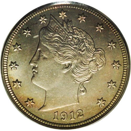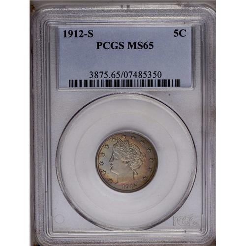 <B>1912-S<5C> MS65 PCGS.</B></I> One in an impressive run of Gem examples of this scarcer branch mint issue, the boldly struck representative displays arcs of multicolored toning on each side that yield to areas of lustrous bluish-gray. Impressive in both a technical and aesthetic sense.