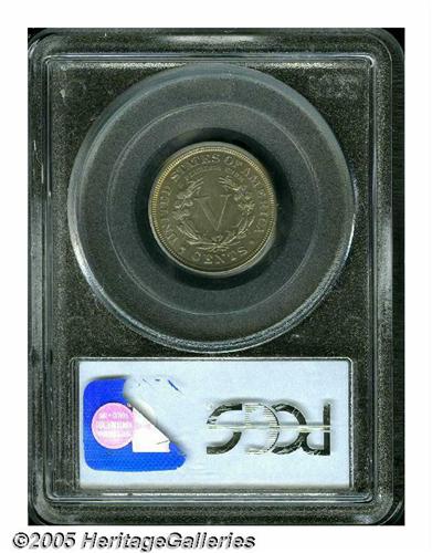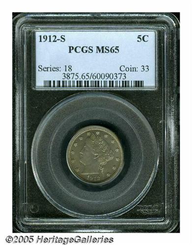 <B>1912-S<5C> MS65 PCGS.</B></I> One of the keys to the series and the only Liberty Nickel issue from the San Francisco Mint. Lustrous, with a bright, metallic brilliance, and a hint of golden coloring. Sharply struck except for the usually problematic obverse stars and reverse left ear of corn. Immaculately preserved, with numerous russet toning specks on each side. An outstanding rarity. Population: 61 in 65, 8 finer (5/05).