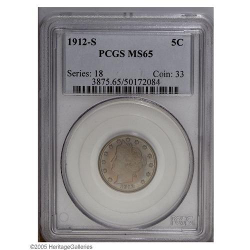 <B>1912-S<5C> MS65 PCGS.</B></I> Satiny luster seen underneath the pale gold and lilac toning is typical of all Mint State 1912-S nickels. This Gem is sharply struck, even down to the individual corn kernels at the lower left side of the wreath. Short die cracks on the reverse extend from the border to upper right serif of N in UNITED and the left side of I in AMERICA. These cracks are often seen on genuine examples of this issue, although the absence of these die cracks does not mean that a particular example is not genuine.