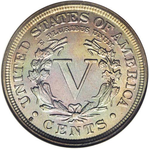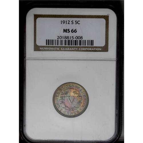 <B>1912-S<5C> MS66 NGC.</B></I> With an original mintage of only 238,000 pieces, it is little wonder that this S-mint delivery is a key date in the series and a prized commodity among specialists. An original specimen, both sides display variegated patina over essentially mark-free surfaces. Bright lime-green, pink-rose, and gold are some of the more prominent colors. While some of the star centrils and wreath details display softness of strike, the balance of the features are quite well impressed for the series. An attractive representation of this historically significant Liberty Head nickel issue.