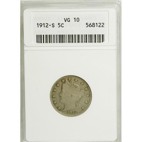 <B>1912-S 5C VG10 ANACS.</B></I> NGC Census: (64/632). PCGS Population (59/655). Mintage: 238,000. Numismedia Wsl. Price: $168. (#3875)<BR><BR><b>Shipping:</b> Coins & Currency (<a target="_blank" href="http://www.heritageauctions.com/common/shipping.php">view shipping information</a>)