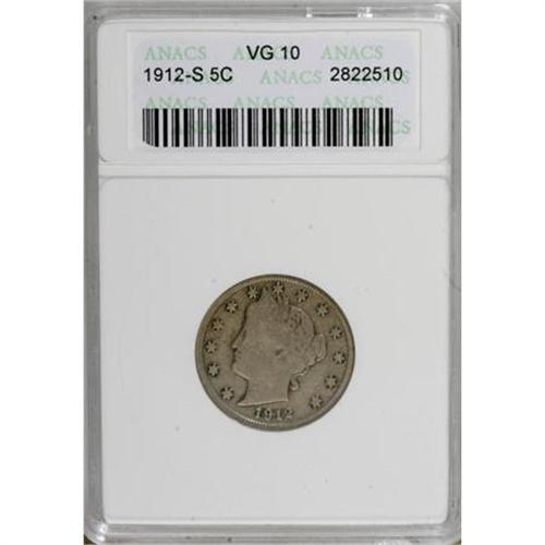 <B>1912-S 5C VG10 ANACS.</B></I> NGC Census: (39/507). PCGS Population (67/682). Mintage: 238,000. Numismedia Wsl. Price for NGC/PCGS coin in VG10: $168. (#3875)<BR><BR><B>Coin Engraver:</B> Charles E. Barber<BR><BR><b>Shipping:</b> Coins & Currency (<a target="_blank" href="http://www.heritageauctions.com/common/shipping.php">view shipping information</a>\)