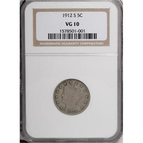<B>1912-S 5C VG10 NGC.</B></I> NGC Census: (47/525). PCGS Population (91/738). Mintage: 238,000. Numismedia Wsl. Price for NGC/PCGS coin in VG10: $168. (#3875)<BR><BR><B>Coin Engraver:</B> Charles E. Barber<BR><BR><b>Shipping:</b> Coins & Currency (<a target="_blank" href="http://www.heritageauctions.com/common/shipping.php">view shipping information</a>)