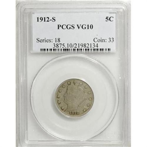 <B>1912-S 5C VG10 PCGS.</B></I> PCGS Population (91/748). NGC Census: (49/527). Mintage: 238,000. Numismedia Wsl. Price for NGC/PCGS coin in VG10: $168. (#3875)<BR><BR><B>Coin Engraver:</B> Charles E. Barber<BR><BR><b>Shipping:</b> Coins & Currency (<a target="_blank" href="http://www.heritageauctions.com/common/shipping.php">view shipping information</a>)