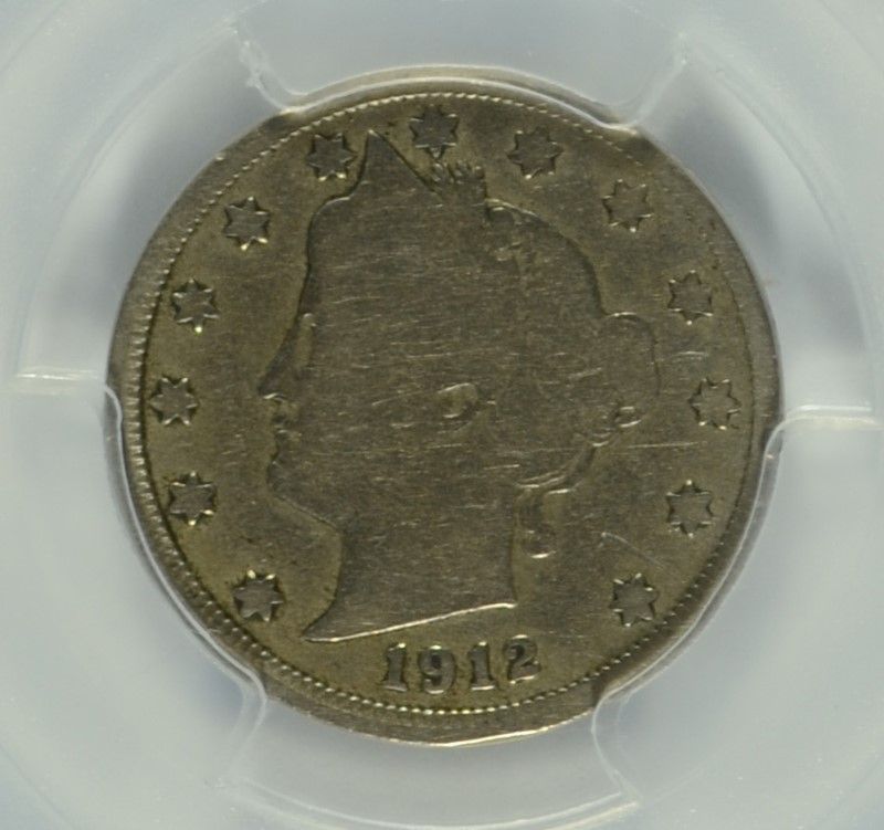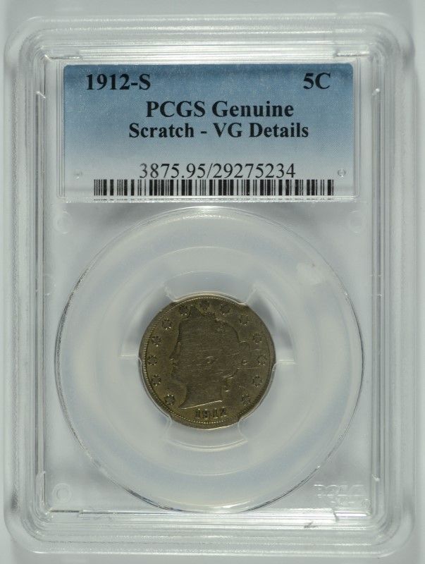 1912-S LIBERTY "V" NICKEL, PCGS VG, VERY MINOR MARK, KEY DATE