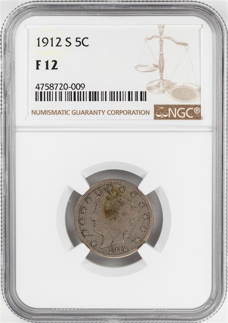 One 1912-S Liberty V Nickel Coin NGC F12. NGC Certified.