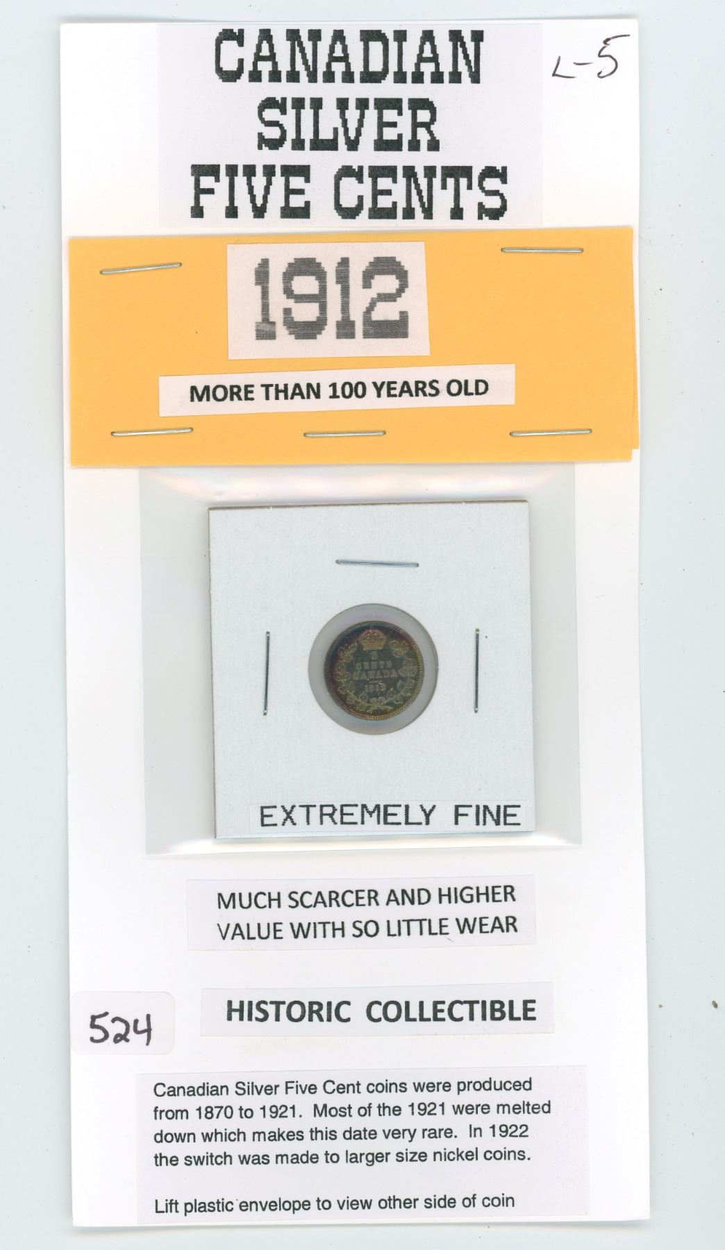 1912 SILVER 5 CENT EXTREMELY FINE CONDITION