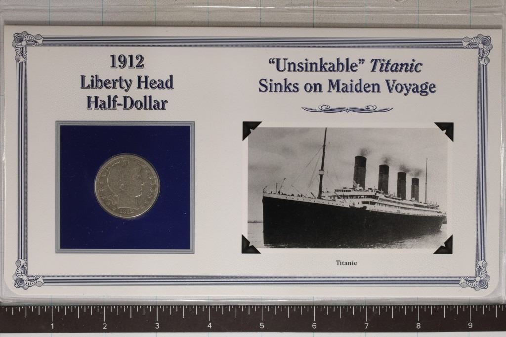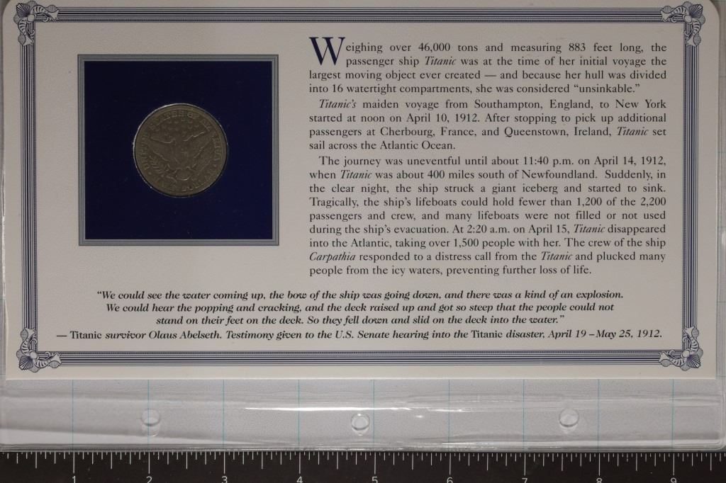 TITANIC SINKS ON MAIDEN VOYAGE INFO CARD IN PLASTIC SLEEVE.