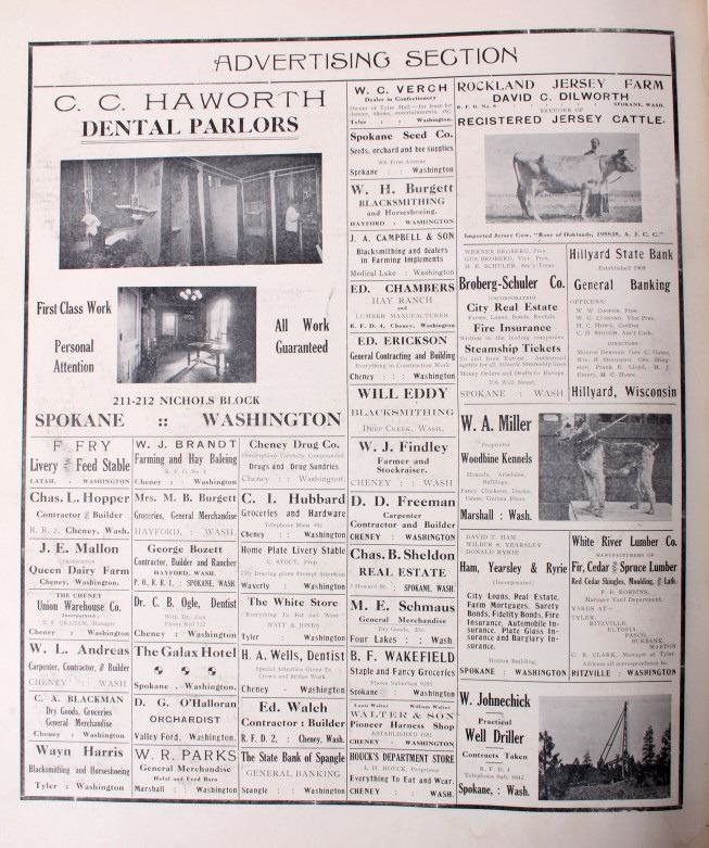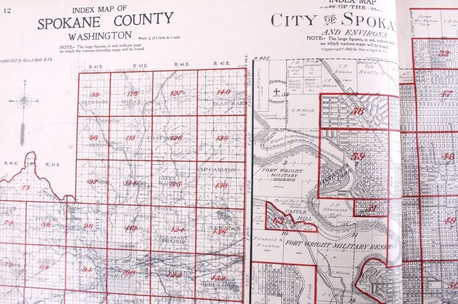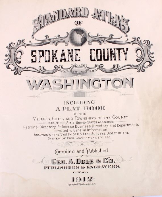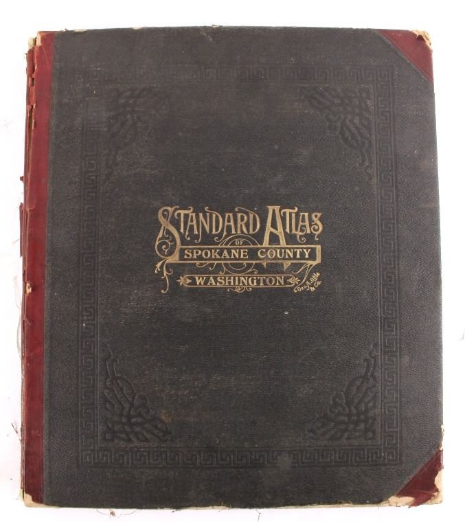 This is a 1912 Standard Atlas of Spokane County. The atlas was published by George A. Ogle & Co. Publishers and Engravers, Chicago. The atlas features numerous maps and projections. The atlas is believed to be complete and shows good overall condition. The back cover is missing as shown. The atlas measures 15.5" x 18".