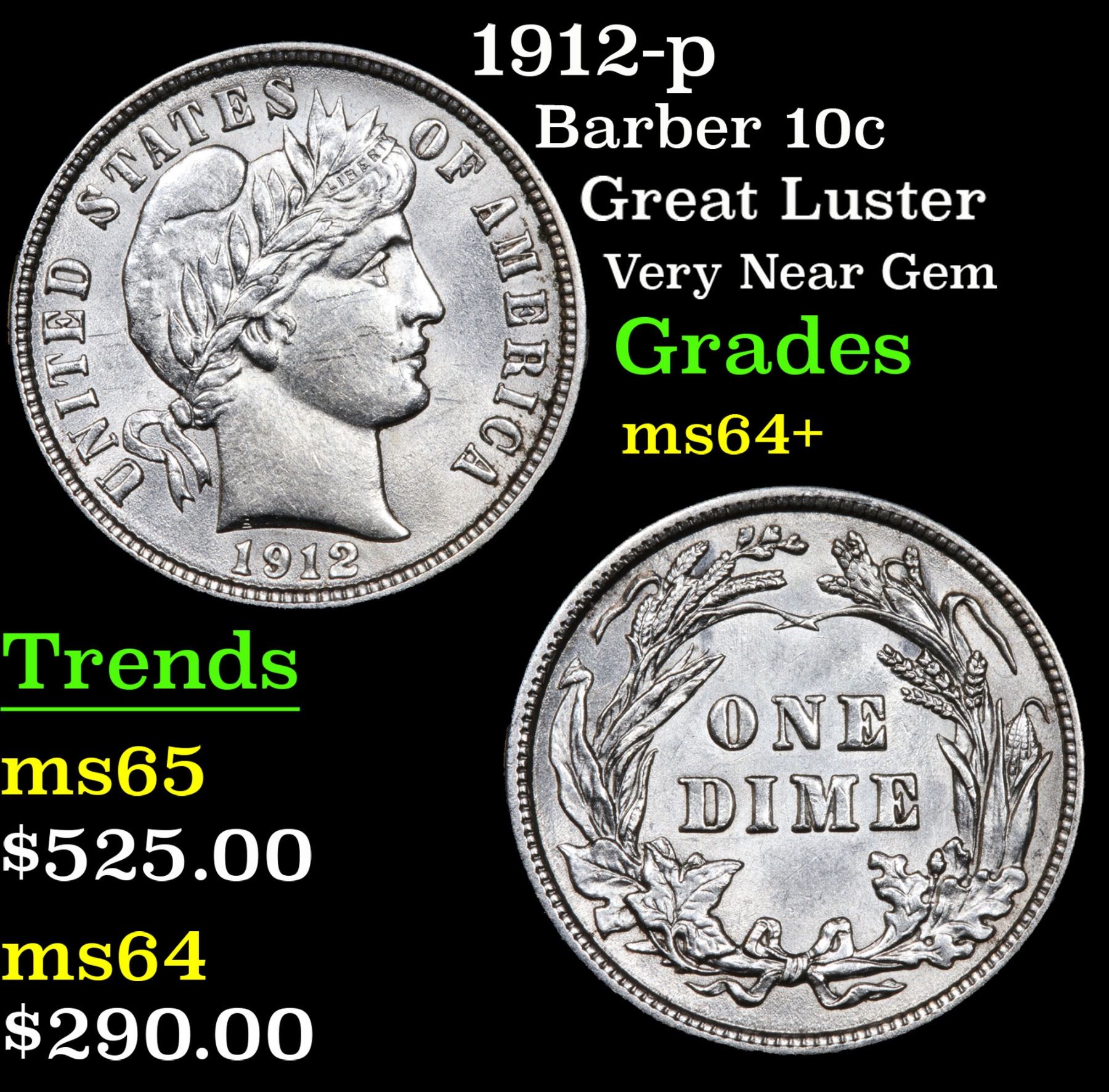 1912-p Great Luster Very Near Gem Barber Dime 10c Grades Choice+ Unc. A Corey's Pick, Bid to Win Coin