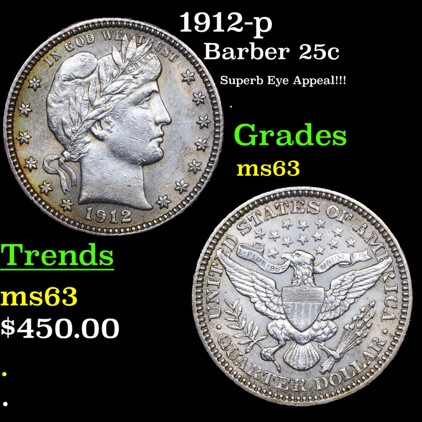1912-p Barber Quarter 25c Graded ms63 By SEGS. A Key Date's Pick, Bid to Win, Don't let it get Away Coin