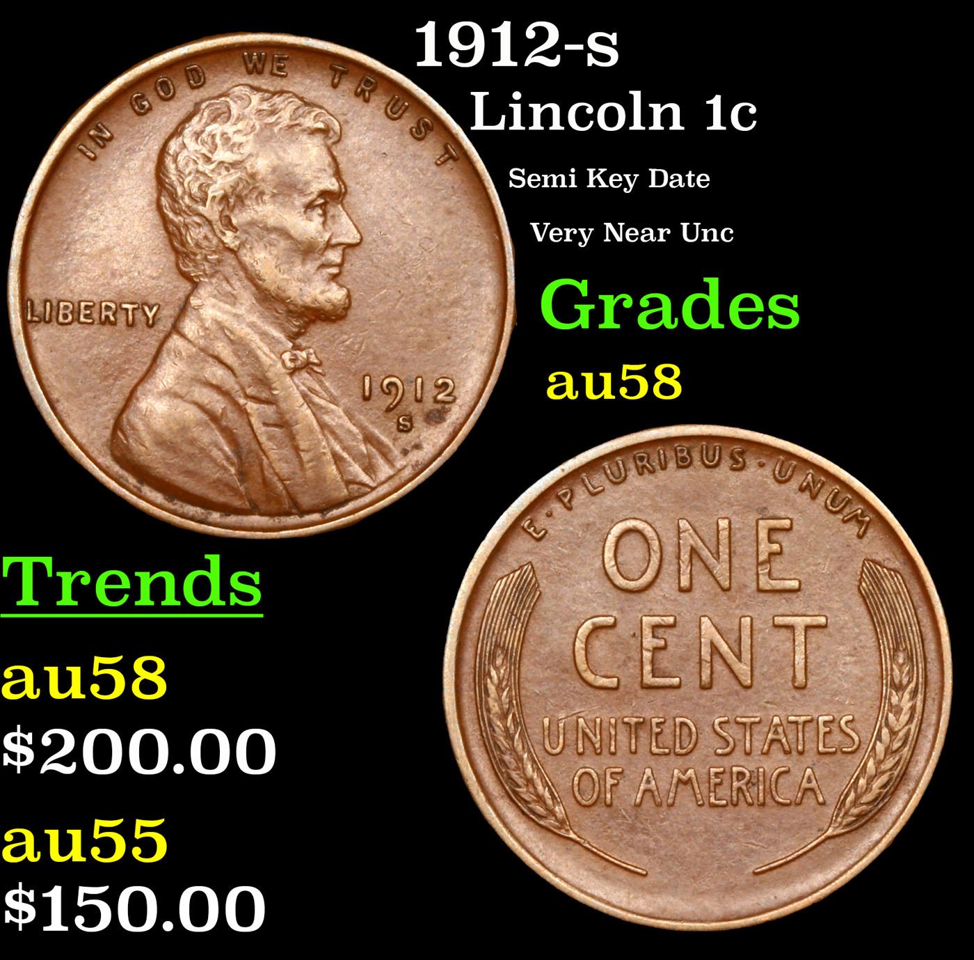 1912-s Lincoln Cent 1c Grades Choice AU/BU Slider. According to David Hall from PCGS, 'The 1912-s, like all early s-mint Lincolns, is a scarce semi-key date in all grades.