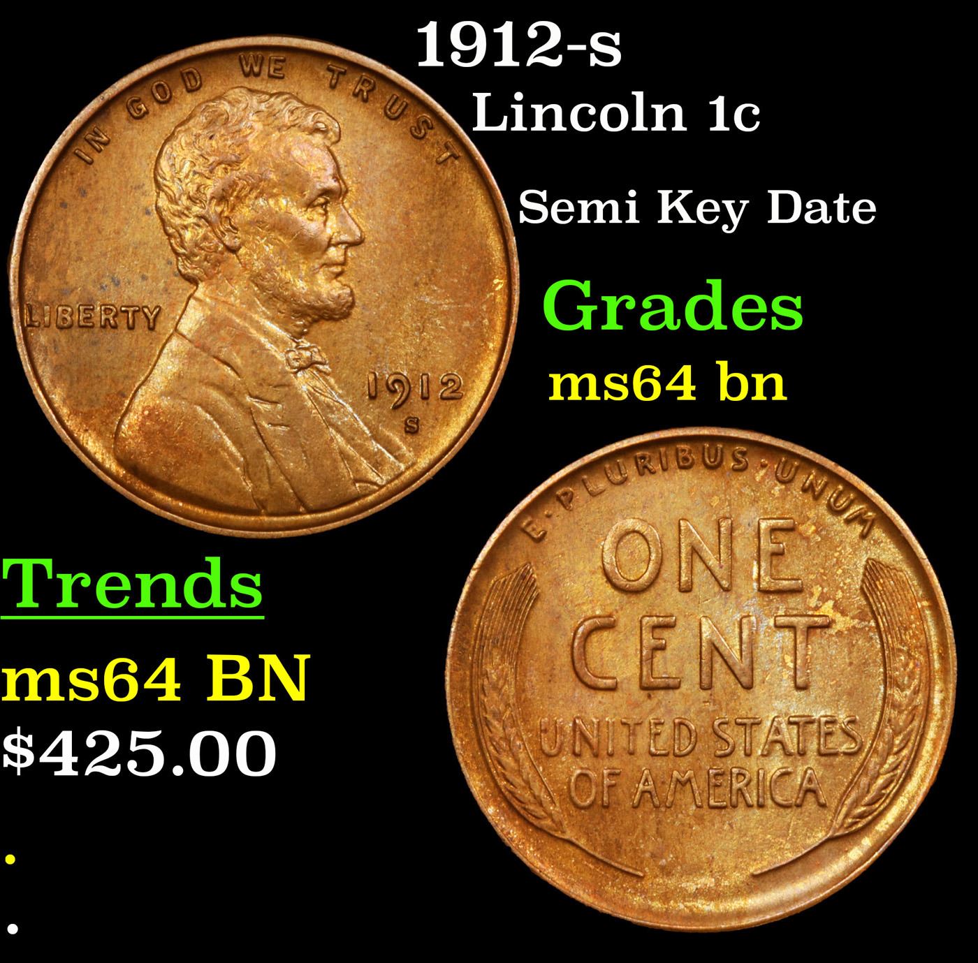 1912-s Lincoln Cent 1c Grades Choice Unc BN. According to David Hall from PCGS, 'The 1912-s, like all early s-mint Lincolns, is a scarce semi-key date in all grades.